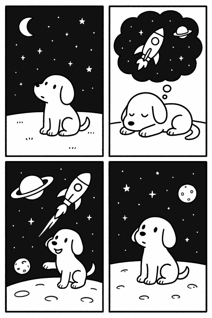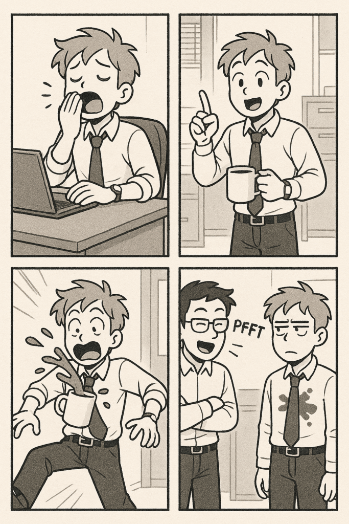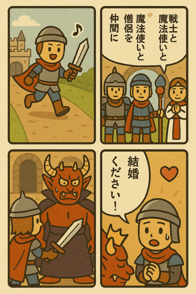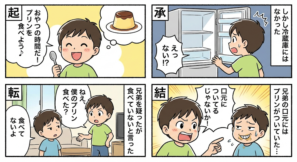 以上の起承転結をもとに四コマ漫画を作成してください。