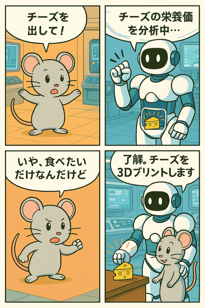 始めはロボットに「チーズを出して」の文脈が伝わらないが、