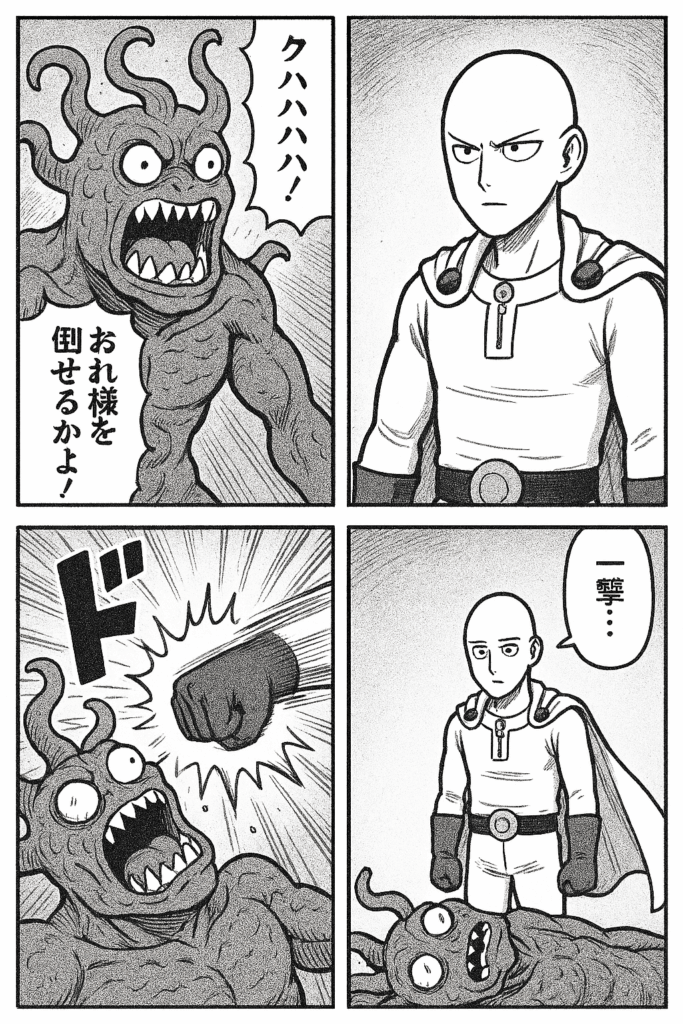 怪人をワンパンで倒すヒーローの4コマ漫画