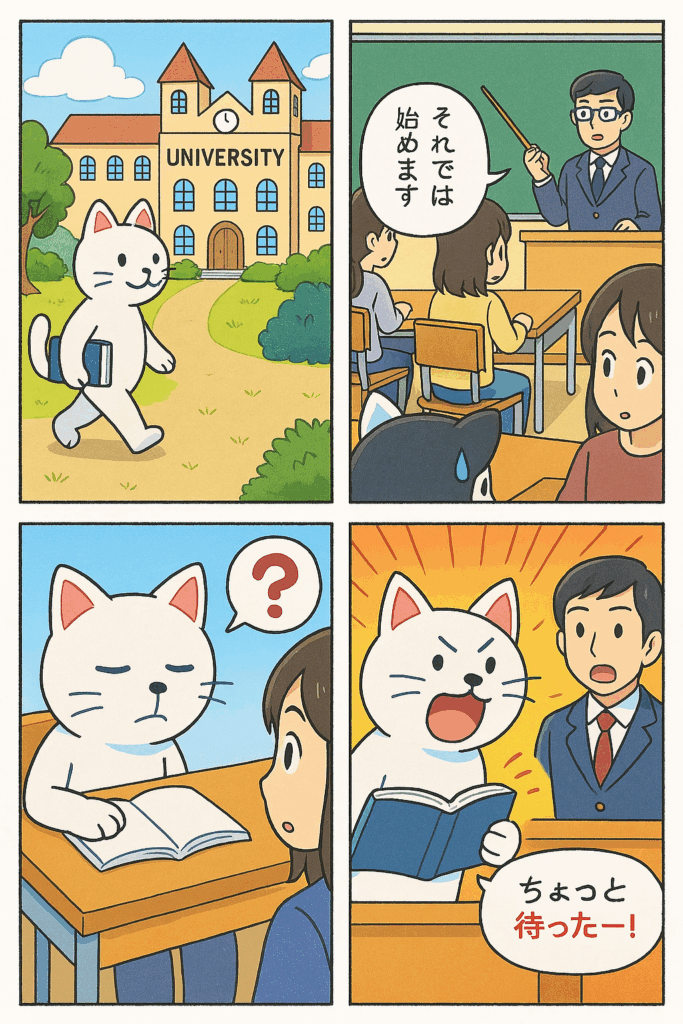 結:猫が突然立ち上がり、教科書を持って熱弁!先生も驚き。