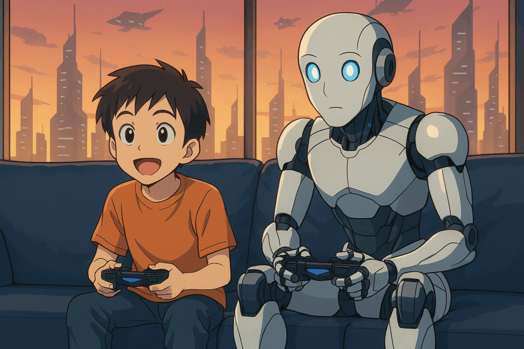 2100年ごろを想定します。ヒューマノイド型ロボットが子供のテレビゲームの対戦相手になってくれている画像を生成してください。二人でテレビ画面を見ている構図で、アニメ風でお願いします。