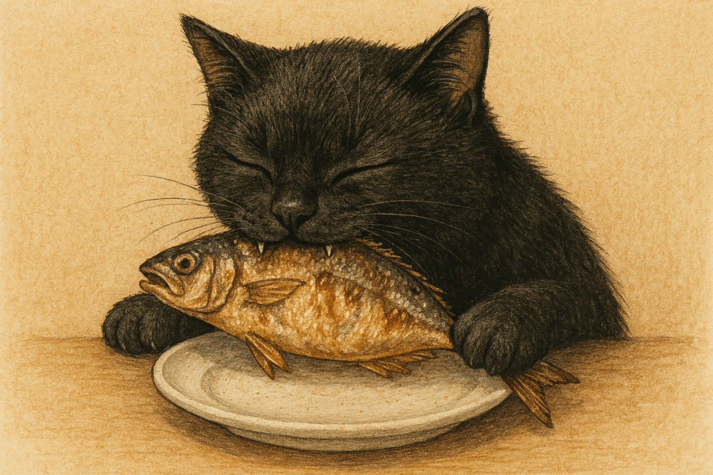 以下のプロンプトをもとにイラストを生成してください。おいしそうに魚を食べている黒猫。