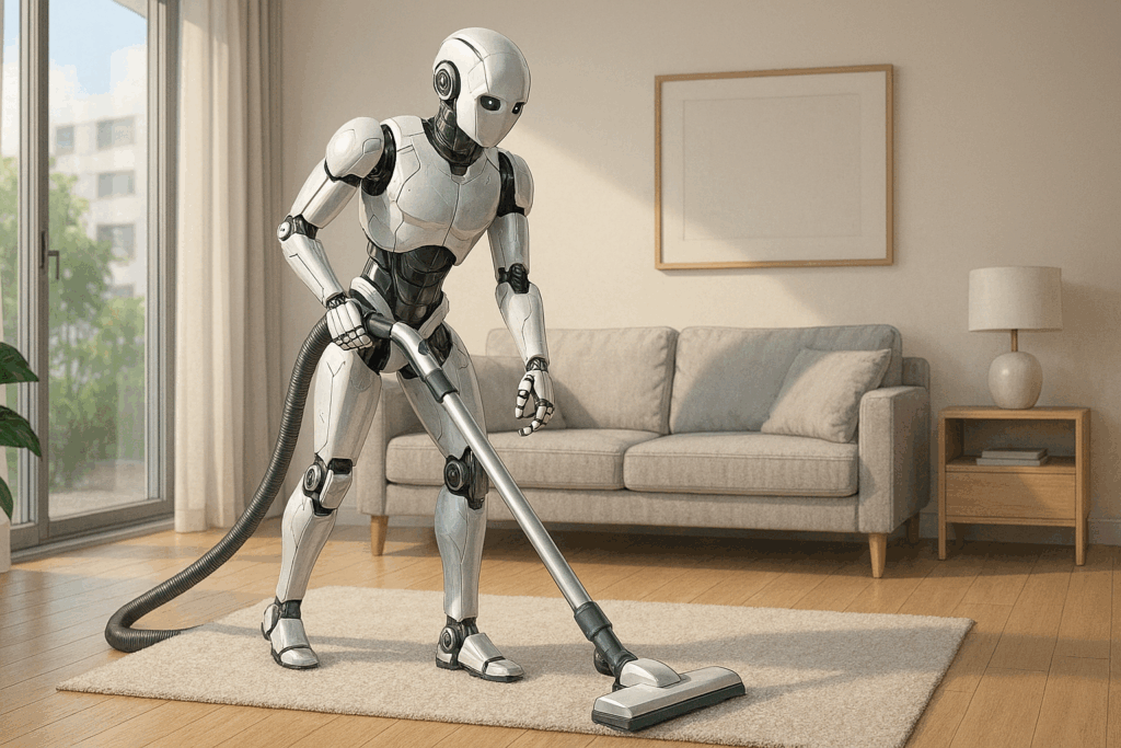 2040年頃を想定します。ヒューマノイド型ロボットが部屋の掃除をしている状況を画像で描写してください。