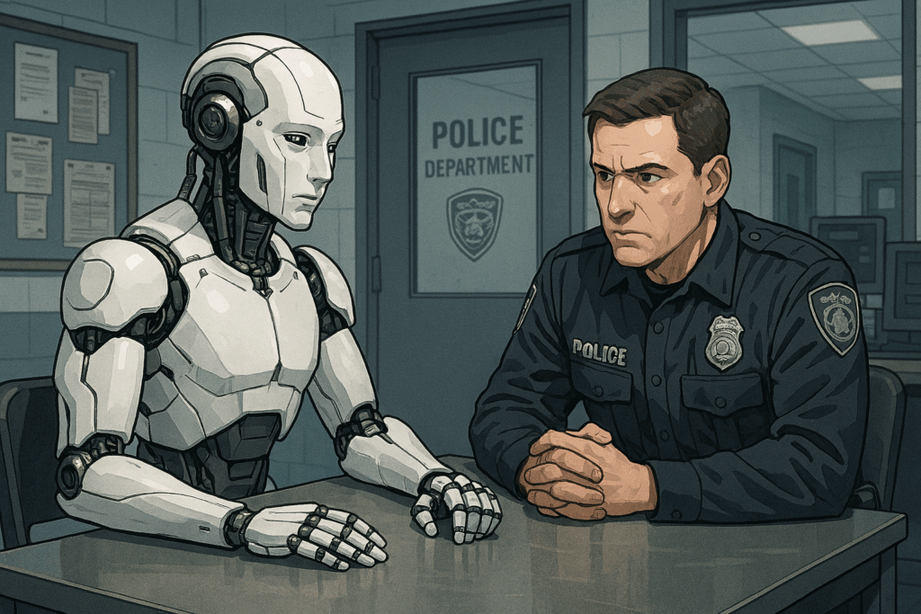 「2040年ごろを想定します。ヒューマノイド型ロボットが警察署内で人間に尋問されている様子を描いてください」