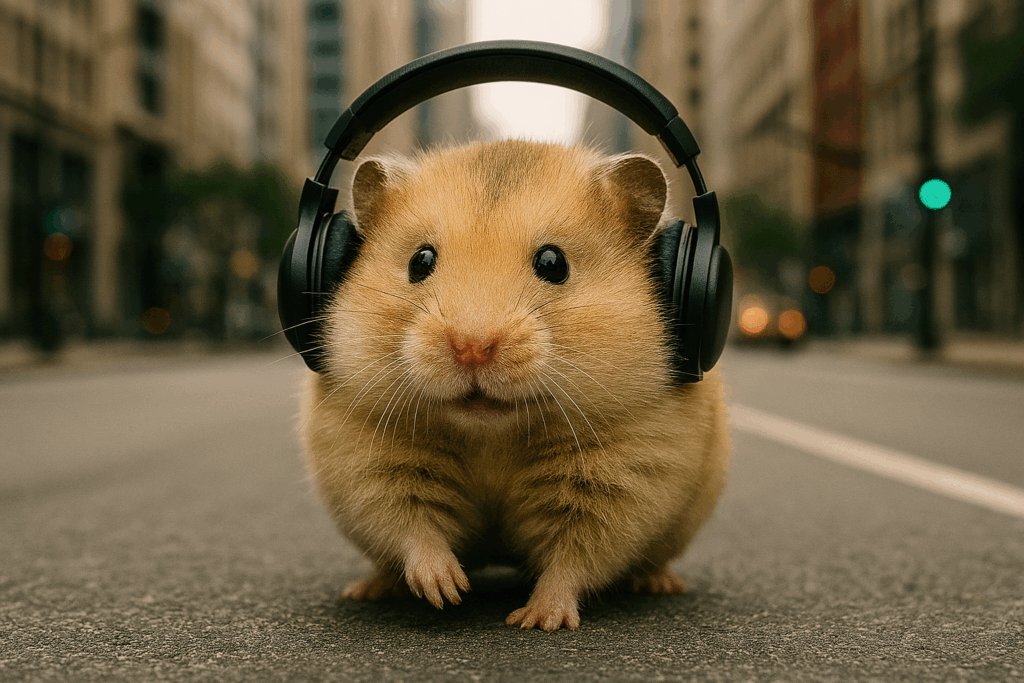 ヘッドフォンをかけているハムスターが都市内を歩く画像を作成してください!