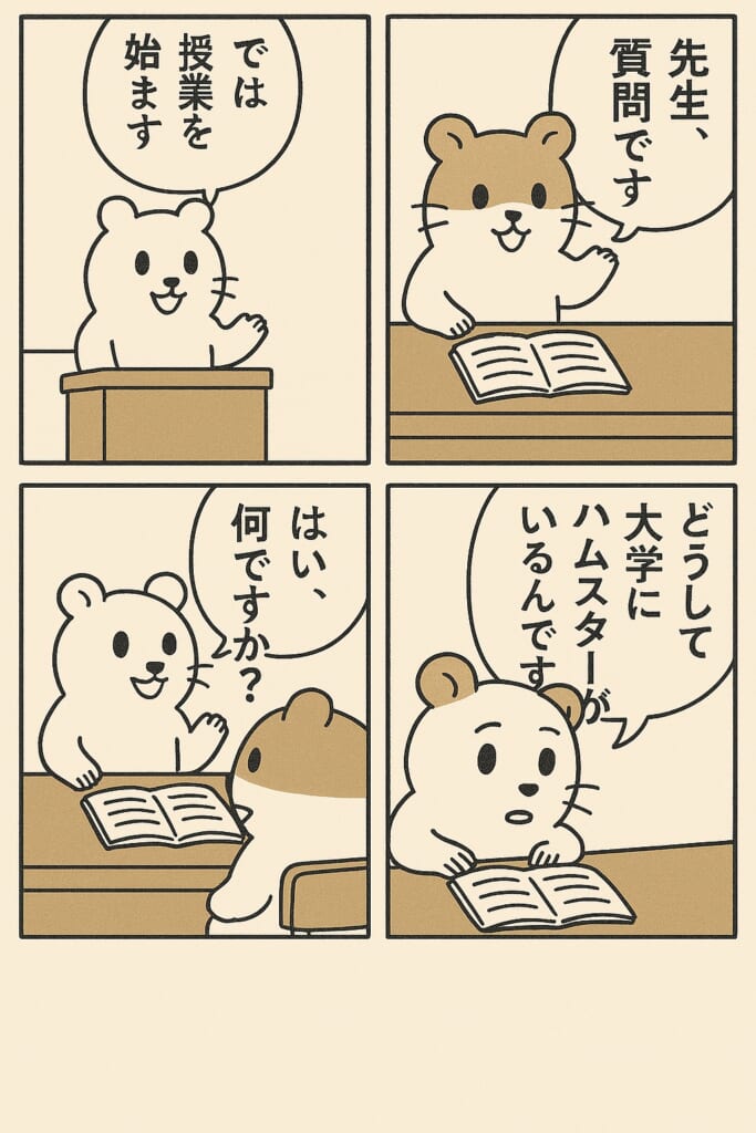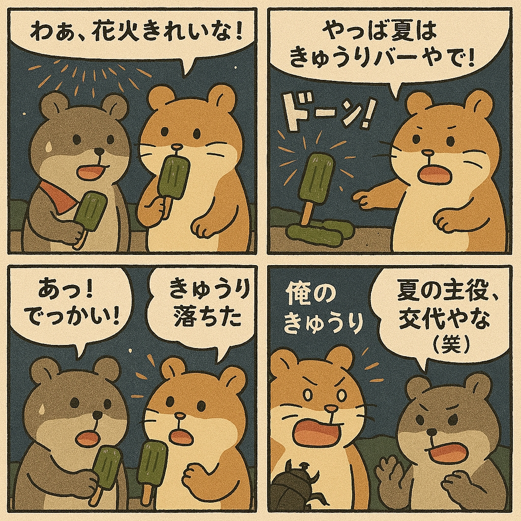 ハムスターカップルが花火を見ながらきゅうりバーを食べる4コマ漫画を作成して。(セリフあり・起承転結あり・ギャグ)