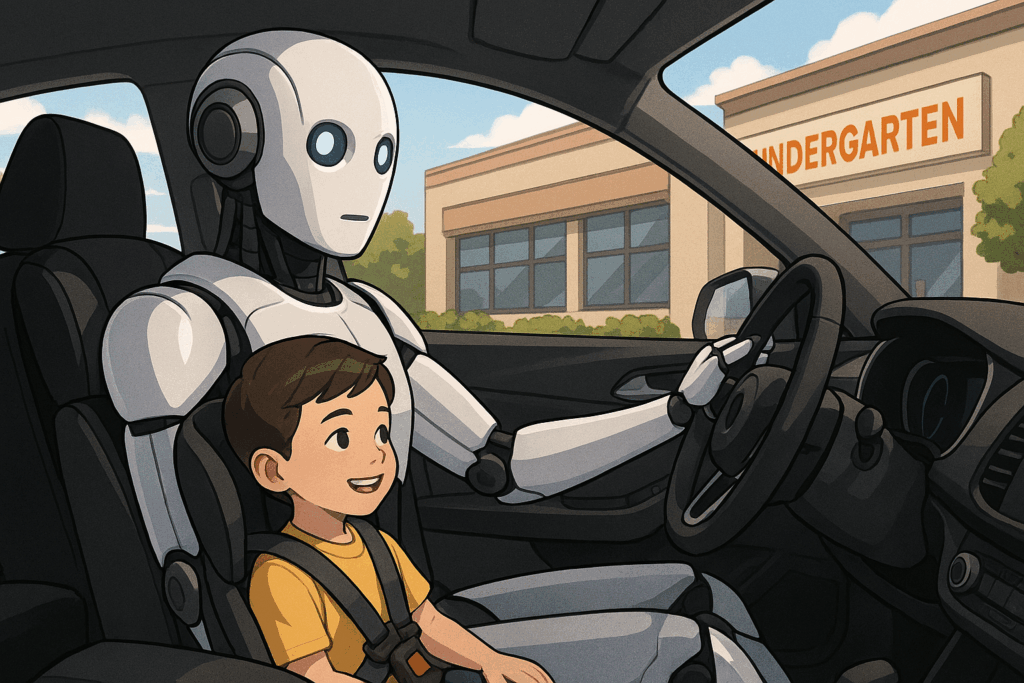 約30年後を想定します。ヒューマノイド型ロボットが人間の子供を幼稚園まで車で送る姿を画像で描写してください。