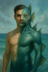 左半身が人間で右半身が魚の半魚人の画像を生成してください