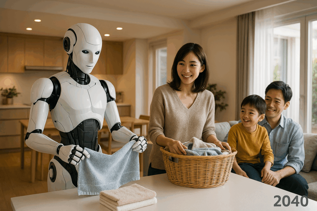 2040年頃を想定します。ヒューマノイド型ロボットが、ある家で子供をもつ家族と共存し家事をしている状況を画像で描写してください。