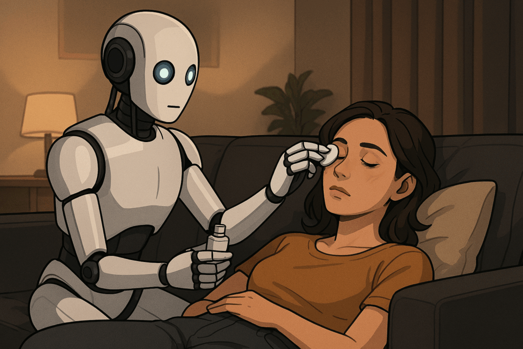 仕事終わり帰宅した女性。毎日残業で疲れてソファに横になっている。その女性の化粧をヒューマノイド型ロボットが消してくれている状況を画像で生成してください。