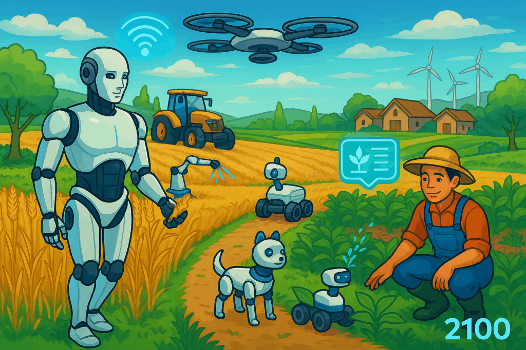 2100年ごろを想定します。ロボットによって便利になった、田舎での農作業の光景を描写してください。