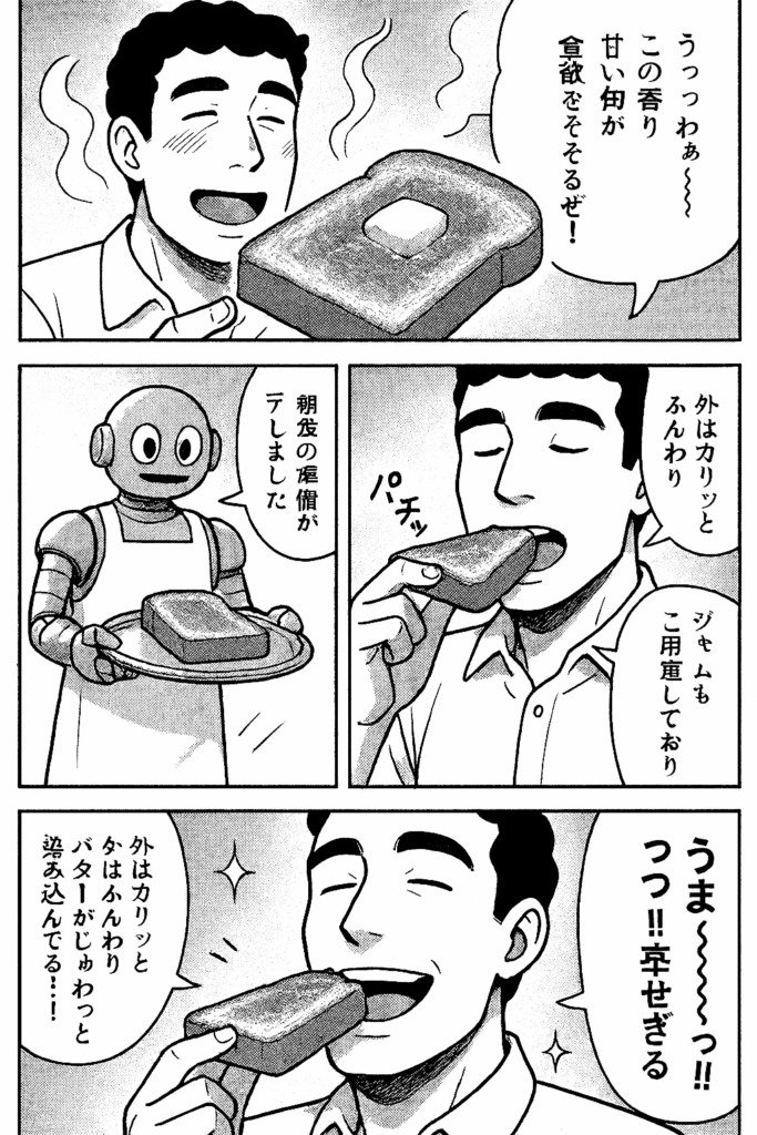 これと同じものを書いてください。ただし条件を付けます。食べているものは朝食のトーストにしてください。 胸に大きなエプロンをつけたロボットを登場させてください。